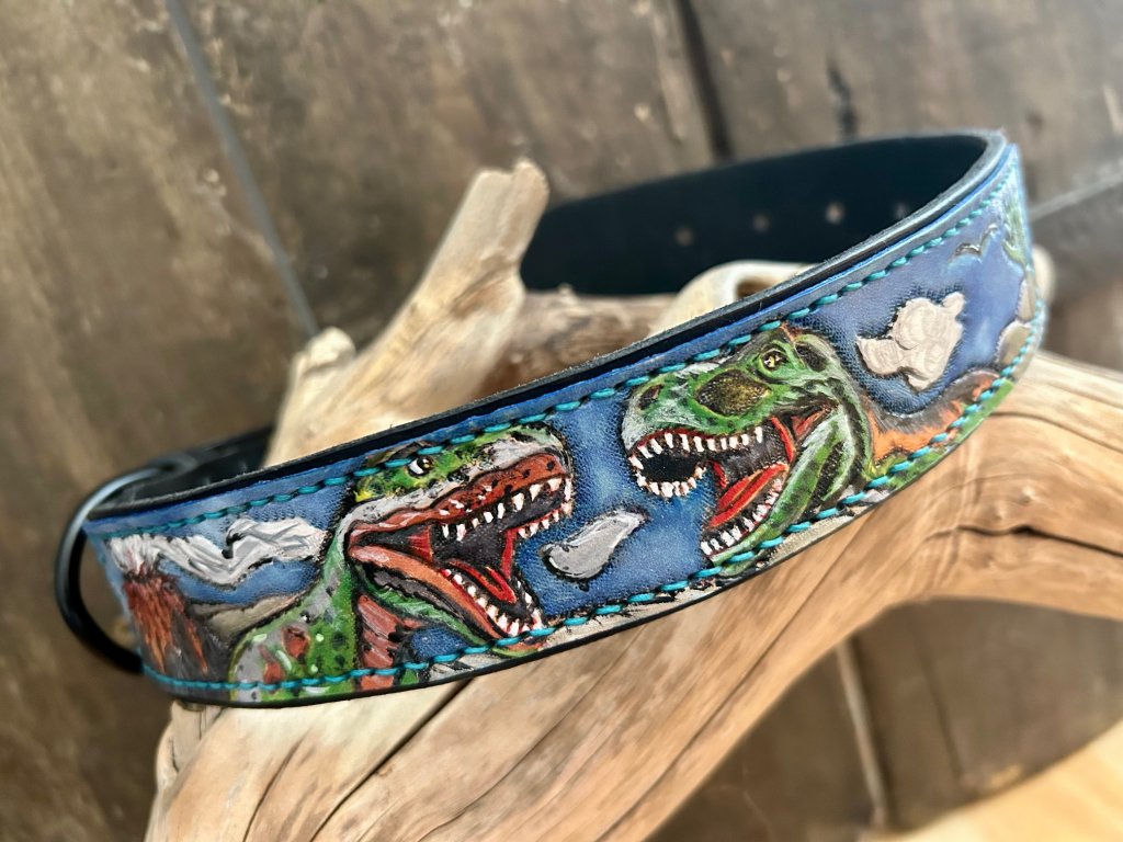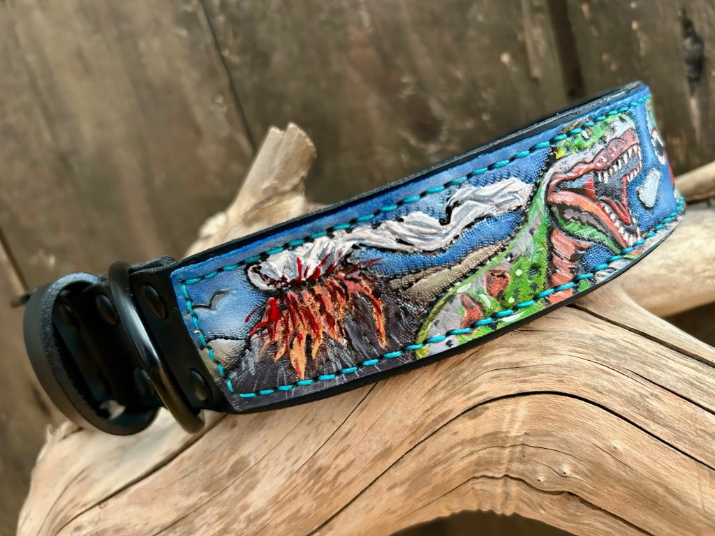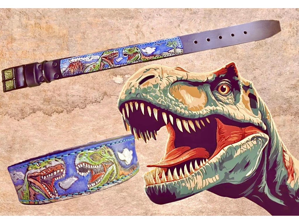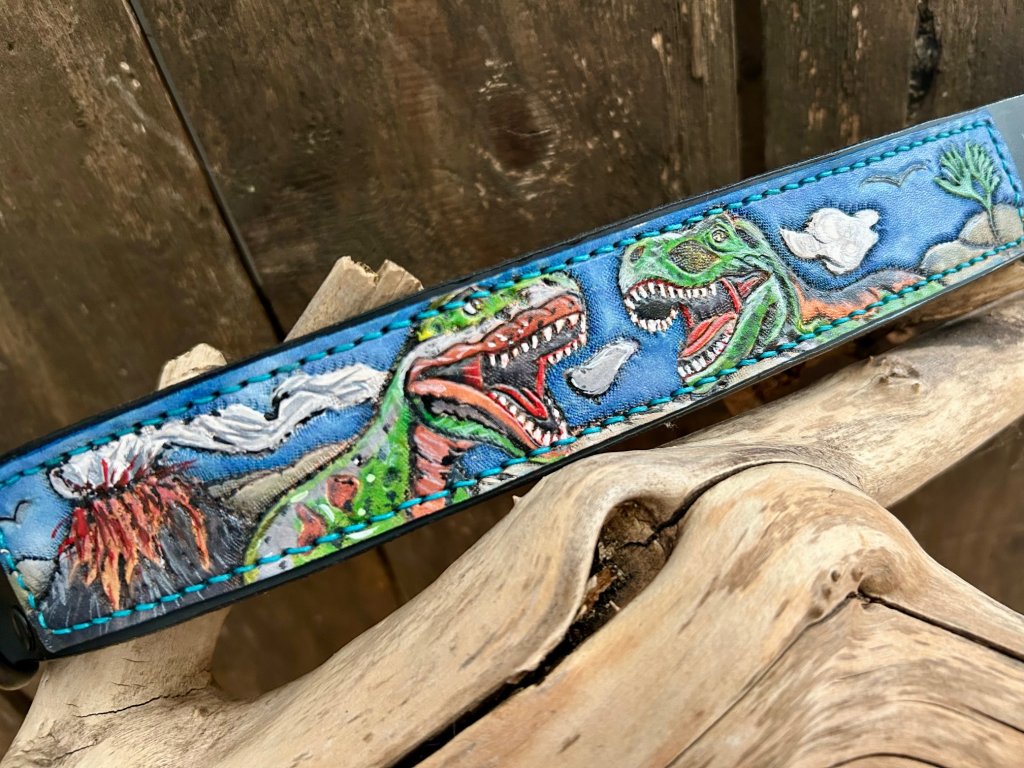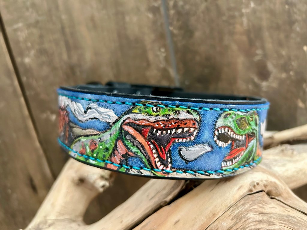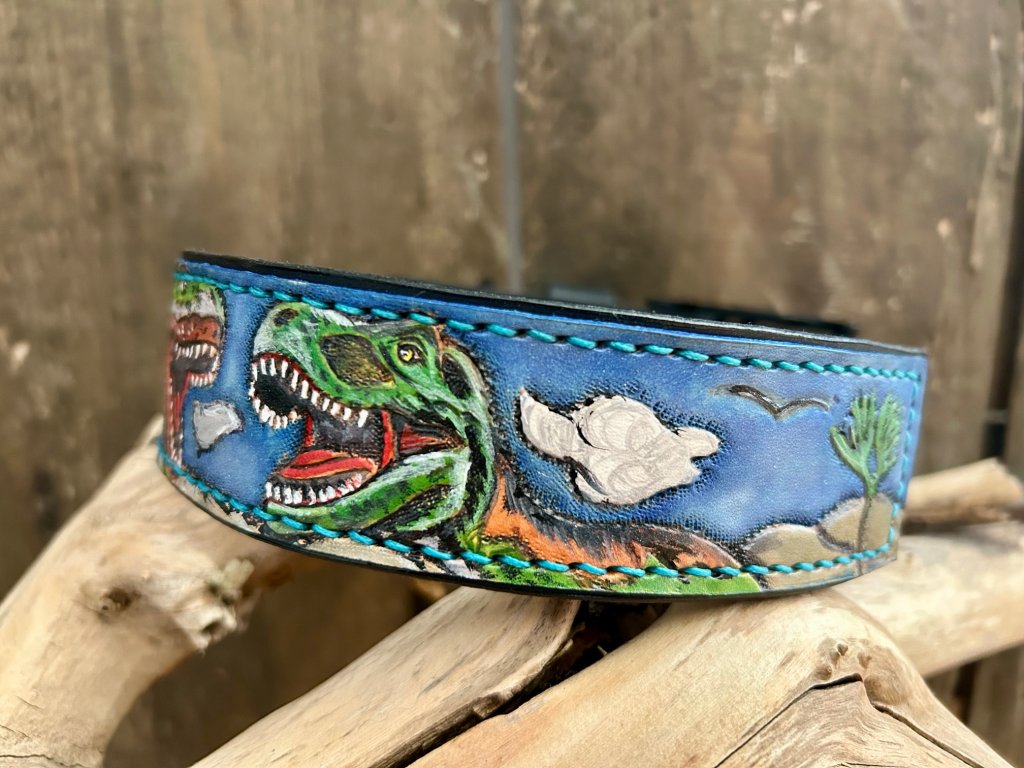 Kožený obojek s motivy dinosaurů, který v sobě spojuje kvalitu zpracování s jedinečným designem. K výrobě byla použita kvalitní lícová hovězí useň, která je na výběr v sedmi barvách. Obojek je nýtovaný, s kvalitní kovovou přezkou a svařovaným polokroužkem k připnutí vodítka. Je možné ho doplnit o vypodložení měkkou jehnětinou, což zajistí psovi opravdové pohodlí.